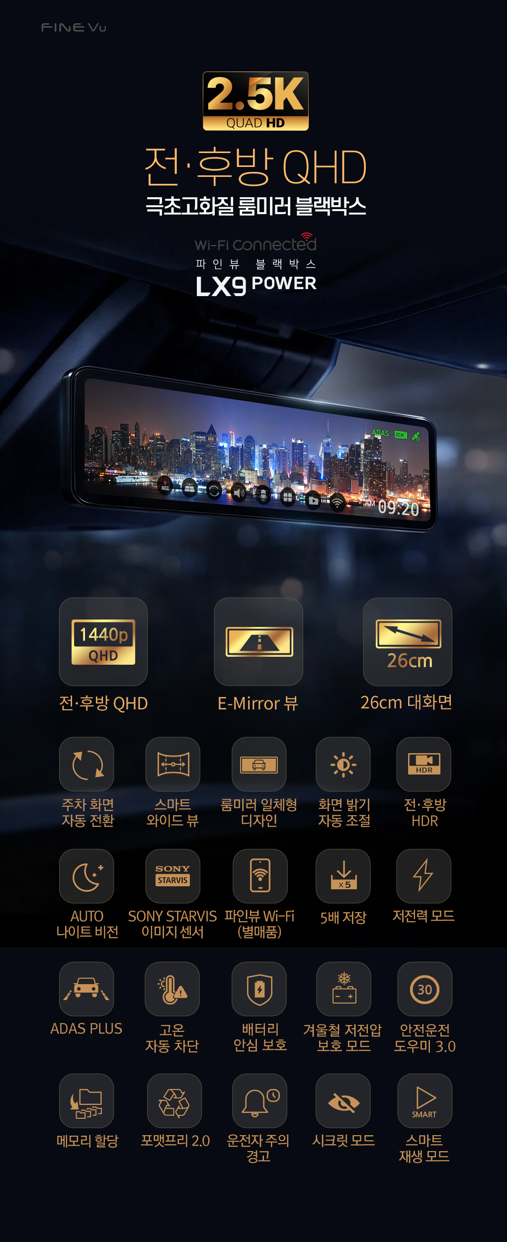 파인뷰 LX9 POWER Wi-Fi 커넥티드 전후방 QHD 룸미러 블랙박스 32GB